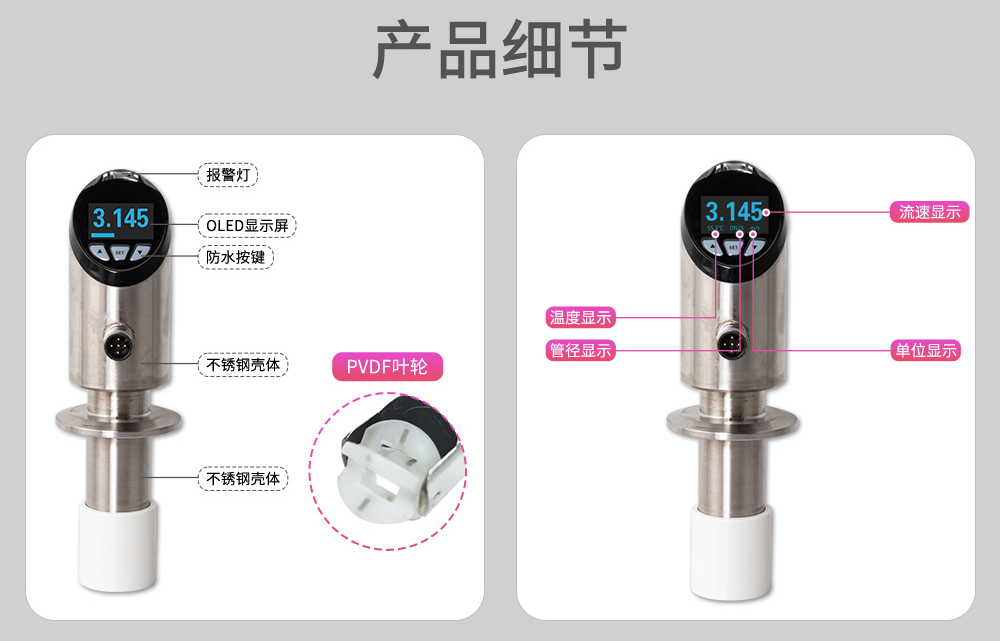 转轮流量计结构简单、稳定性高、安装维修使用方便等特点,可对管道中的液体流动及温度情况进行实时监控,提供流量及温度的信号输出,流量及温度报警开关输出,并采用 OLED 显示屏实时显示流体流速及温度,实现管道当中温度流量一体式的监控。被广泛应用于半导体、光伏、石油化工、电力、治金、钢厂、造纸、食口品加工、水处理、电池厂等行业。