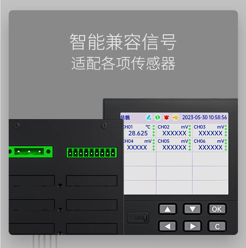 本产品为彩屏无纸记录仪采用高速、高性能32位ARM处理器和5.6英寸LED背光的320*240点阵式液晶显示屏。