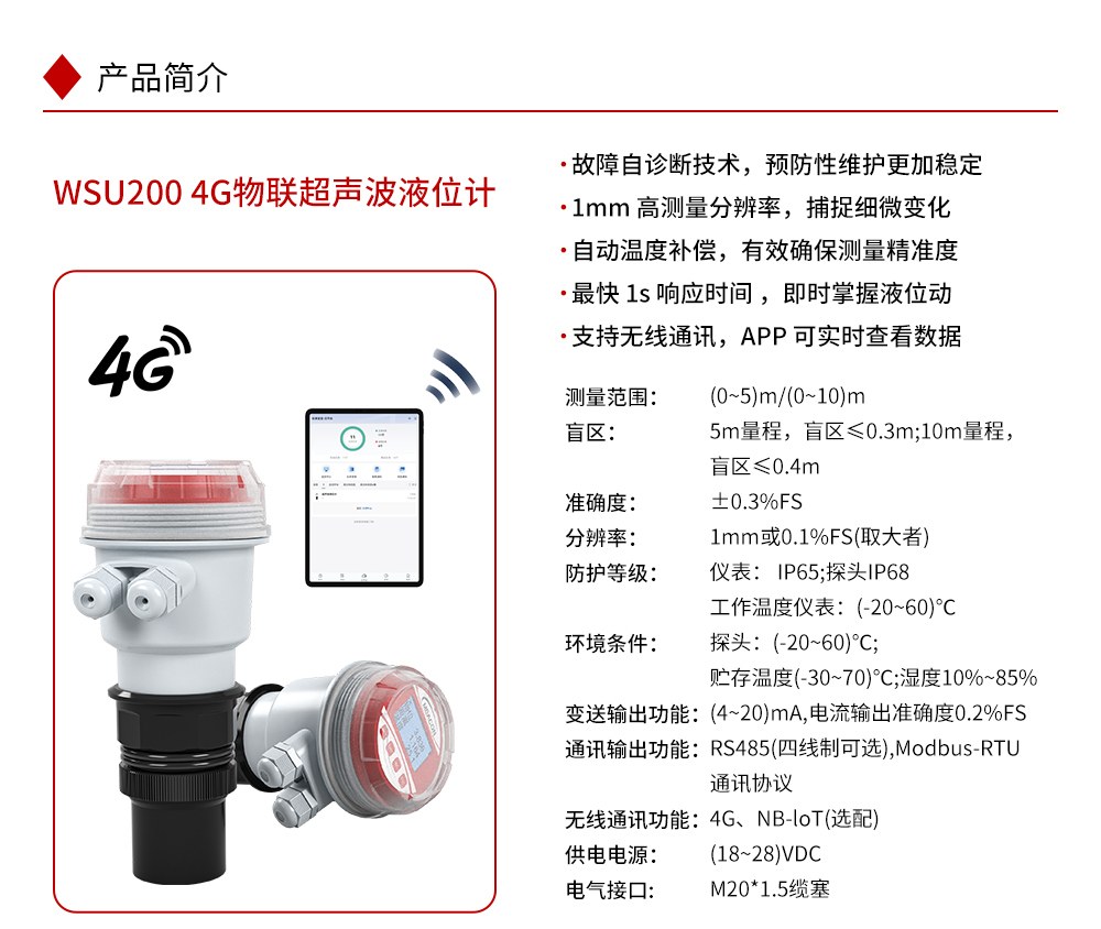 5500jcjc线路检测WSU-200 4G物联超声波液位计具有高可靠性、高性价比、易安装维护的液位/物位测量仪器,可广泛用于各种液体和固体物料高度的测量。本产品可选配 NB-IoT 无线通讯功能,用户可在仪表云平台进行数据查看和远程监控。常见的应用工况,如市政、化工、储运等工业环境中的河流、水池、储罐等液位测量。咨询热线:400-152-1718